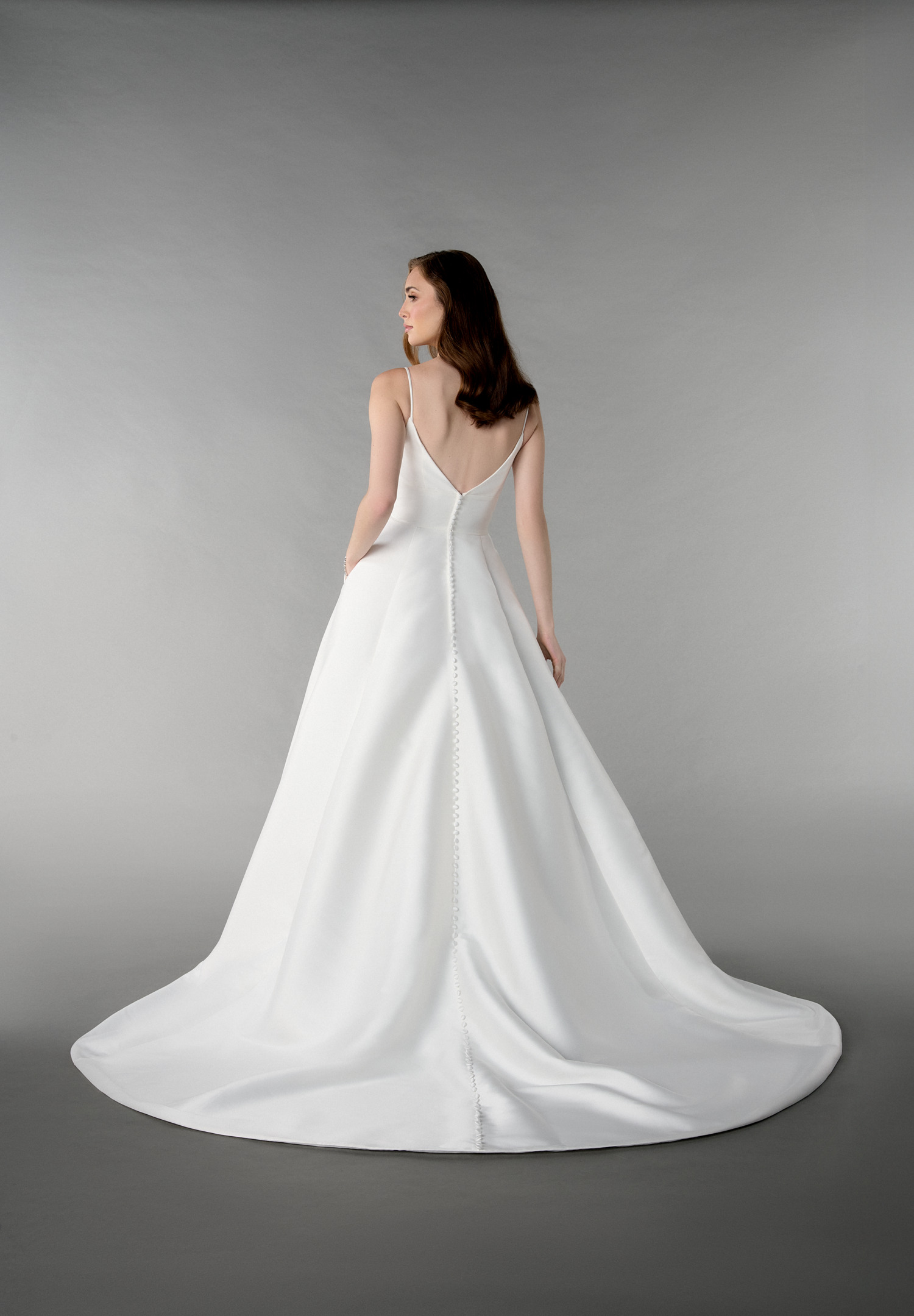 Μινιμαλιστικό νυφικό από Μικάντο σε γραμμή Α με λαιμόκοψη μπικίνι και λεπτές τιράντες