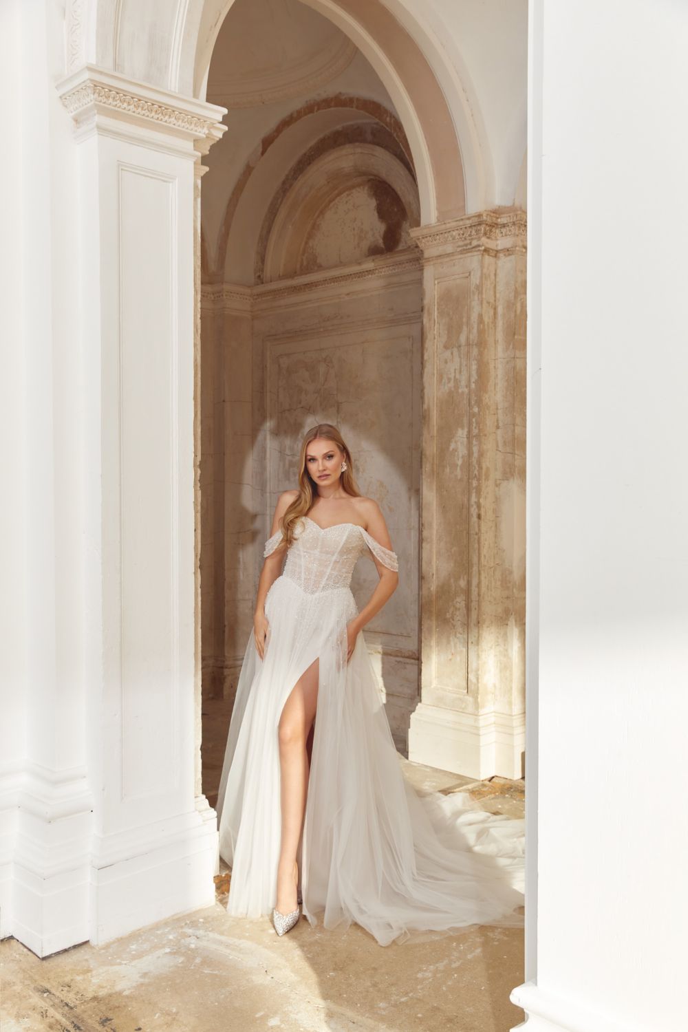 Νυφικό τούλι σε γραμμή Α με καρδιά ντεκολτέ. Το μπούστο διακοσμείται με διάσπαρτες πούλιες και πέρλες που συνεχίζονται στη φούστα. Το διάφανο μπούστο αποκαλύπτει boning και στρώση patterned glitter τούλι μπροστά και πίσω. Ολοκληρώνεται με κουμπιά στη Basque μέση, ουρά chapel και σκίσιμο στη φούστα. Συνοδεύεται από αποσπώμενες τιράντες.