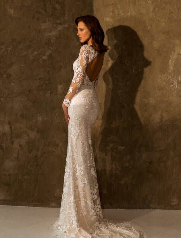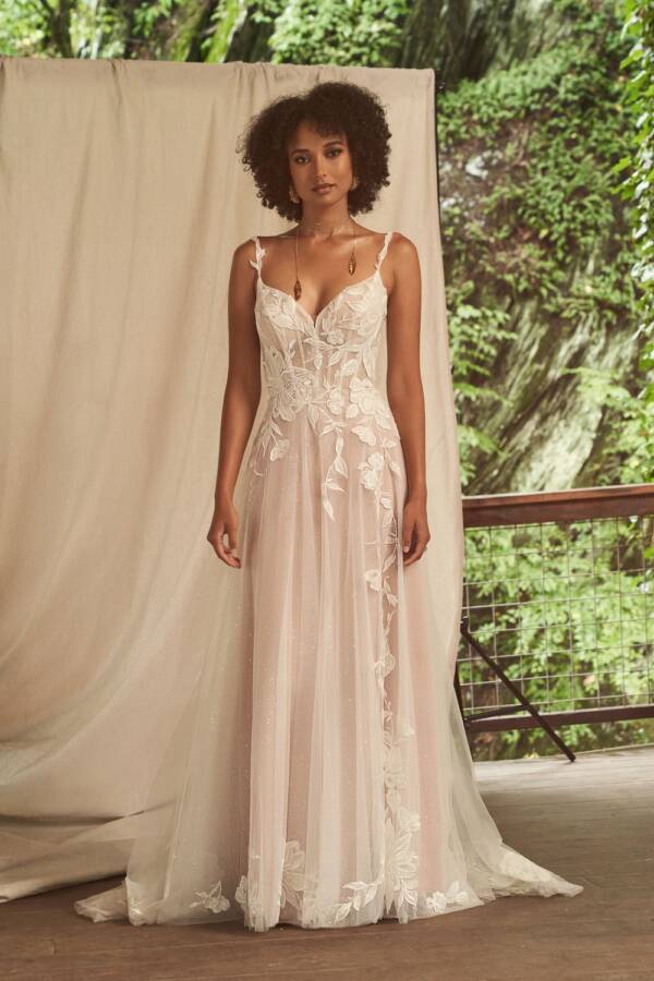 ρομαντικο μποχο νυφικο με μεταξωτο τουλι στο χρωμα της πουδρας και δαντελες διασπαρτες με προαιρετικο σκισιμο στο ποδι και λεπτη τιραντα με δαντελα και βαθια πλατη