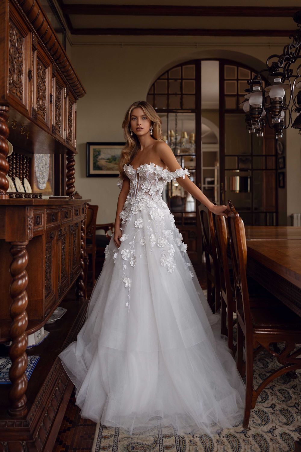 ρομαντικο νυφικο με γαλλικες δαντελες και χειροποιητα τρισδιαστατα λουλουδια , και μανικακι φτερο που πεφτει στους ωμους