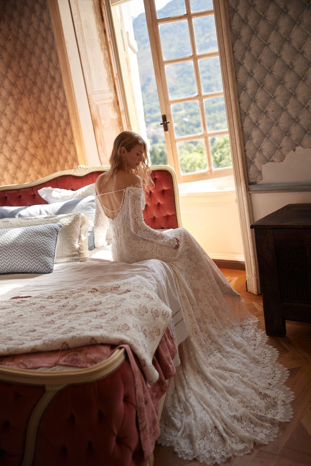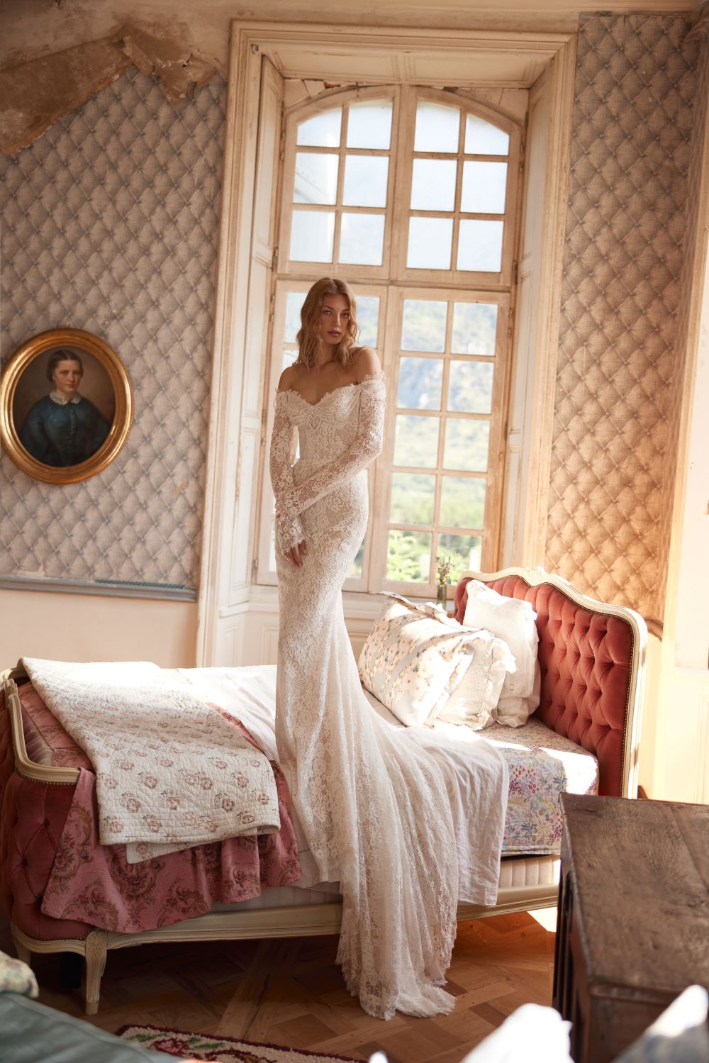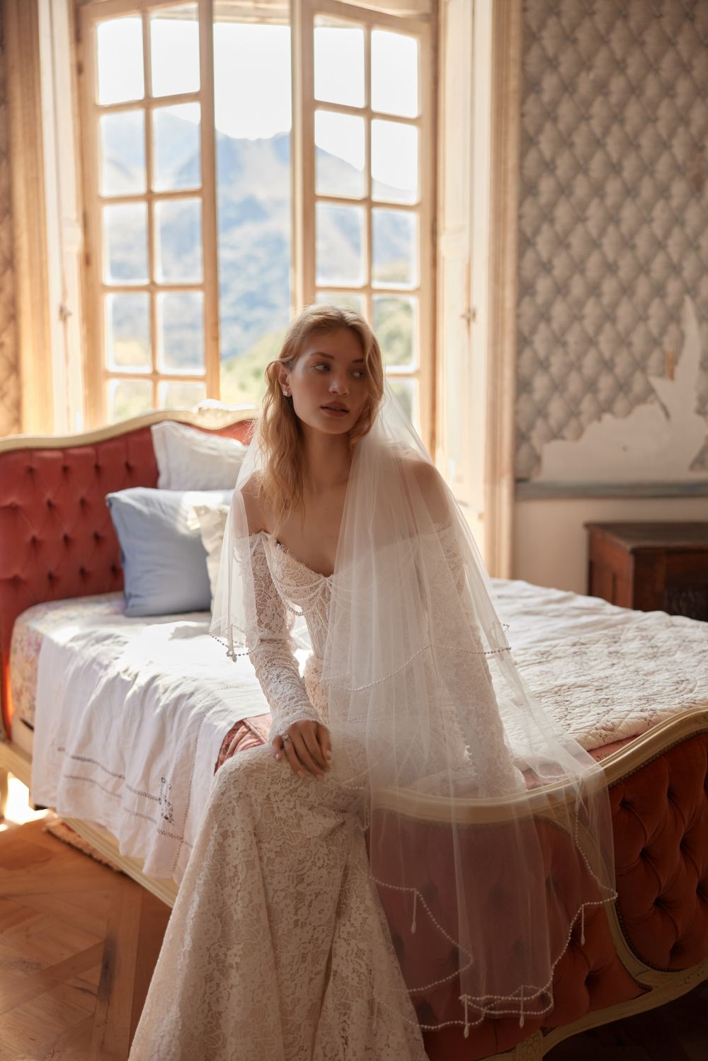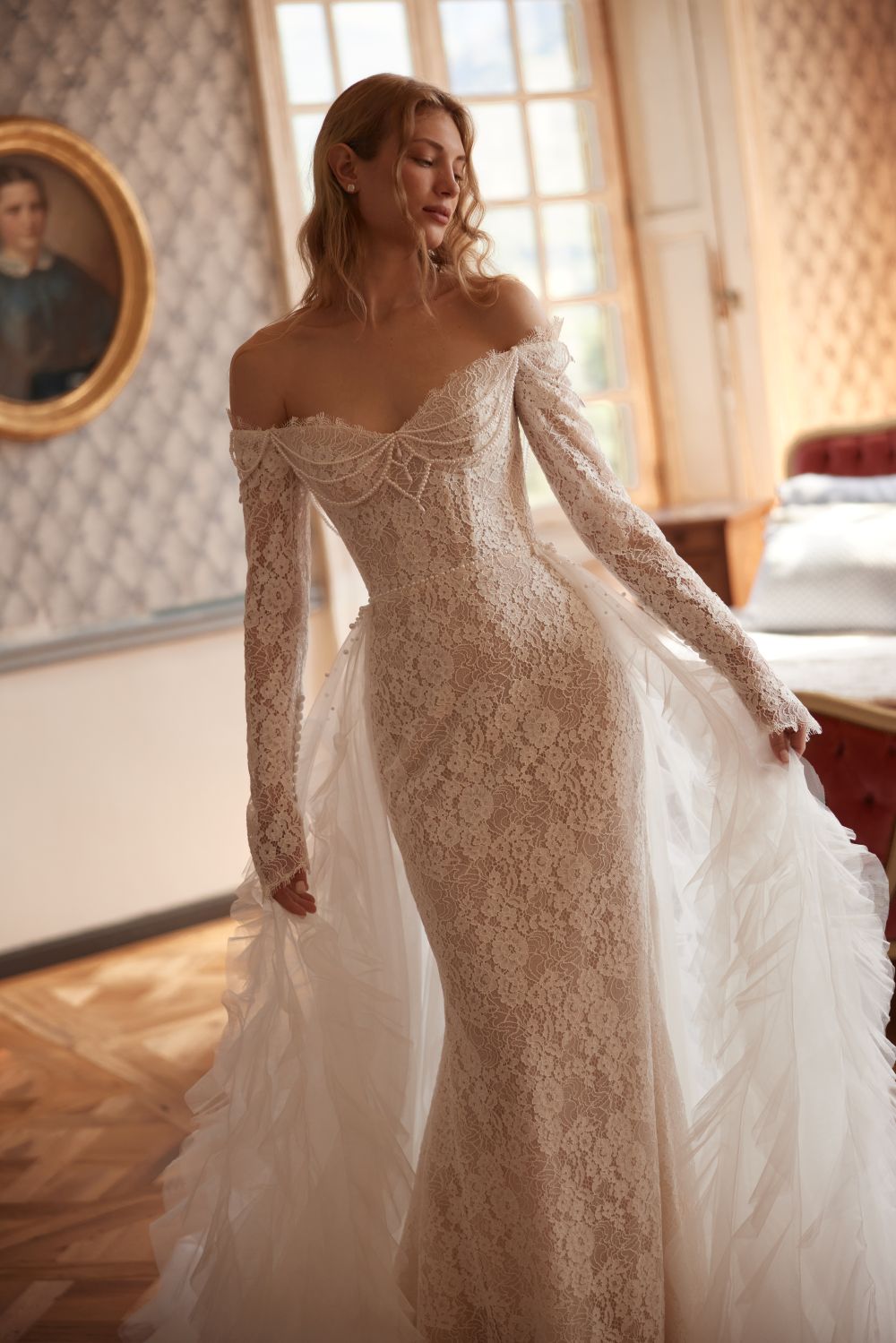 Ένα πολυτελές ημιδιαφανές φόρεμα γοργόνας είναι φτιαγμένο από δαντέλα με χάντρες. Το μπούστο ειναι εξωμο κατασκευασμένο από δαντέλα με χάντρες και κεντημένο στο χέρι με χάντρες, κρύσταλλα και πούλιες. Η φούστα με χάντρες και πούλιες αναδεικνύει απαλά τη σιλουέτα και εκτείνεται σε μια μικρή ουρά.