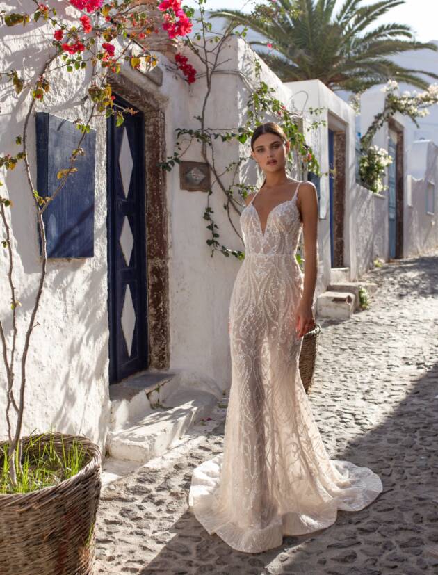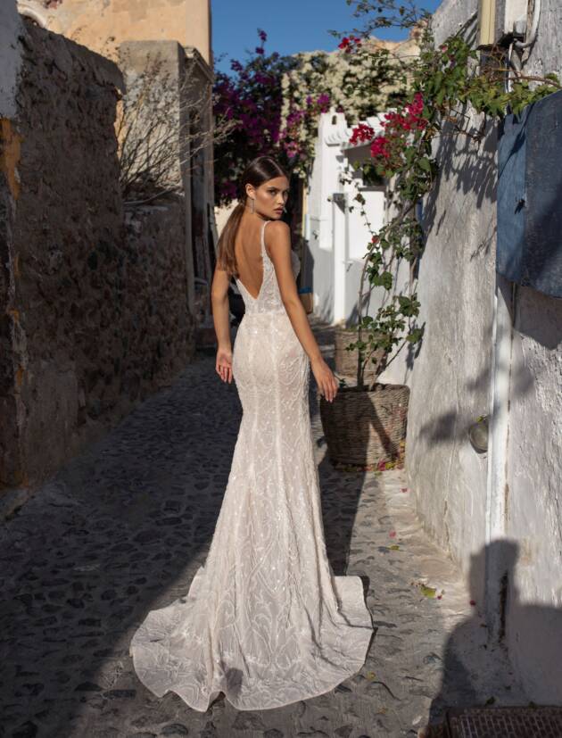 λεπτο τιραντακι με κορσαζ σε βε απο βαμβακερη μποχο δαντελα και κοψιματα στα πλαινα. απαλο βολαν στη φουστα με σκισιματα στα ποδια που καλυπτονται απο τουλι