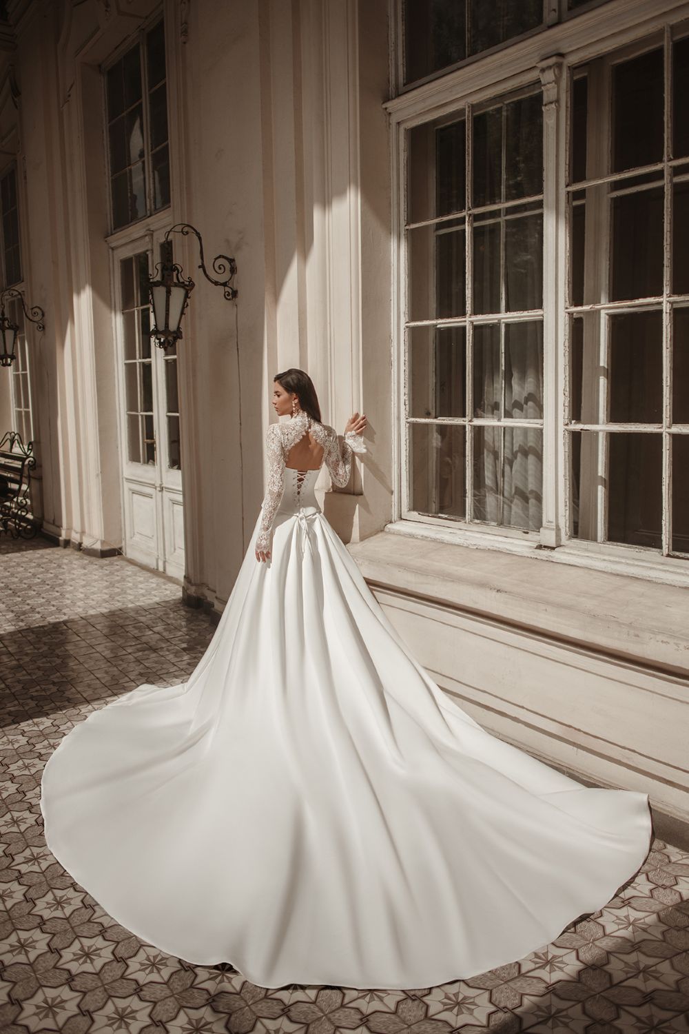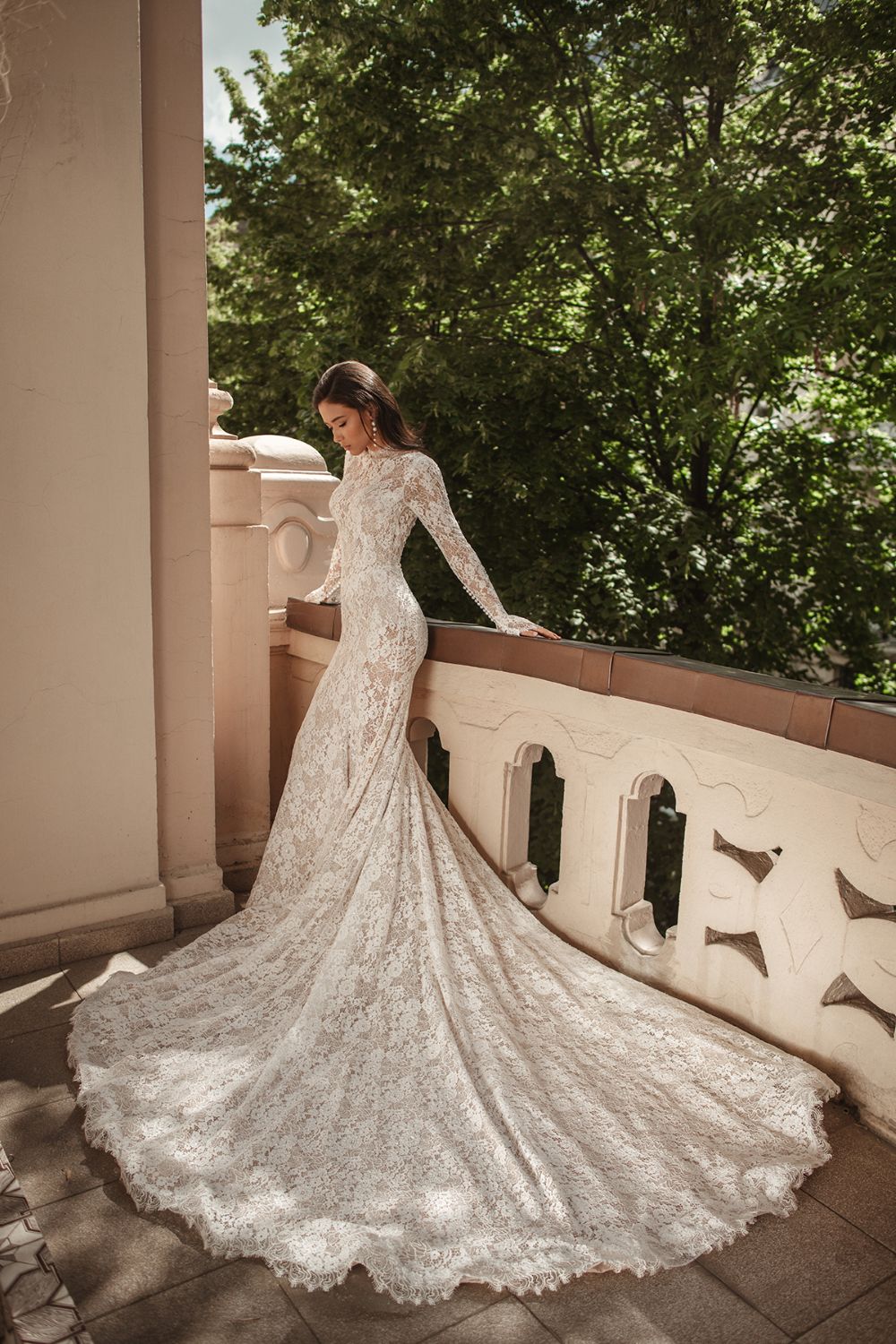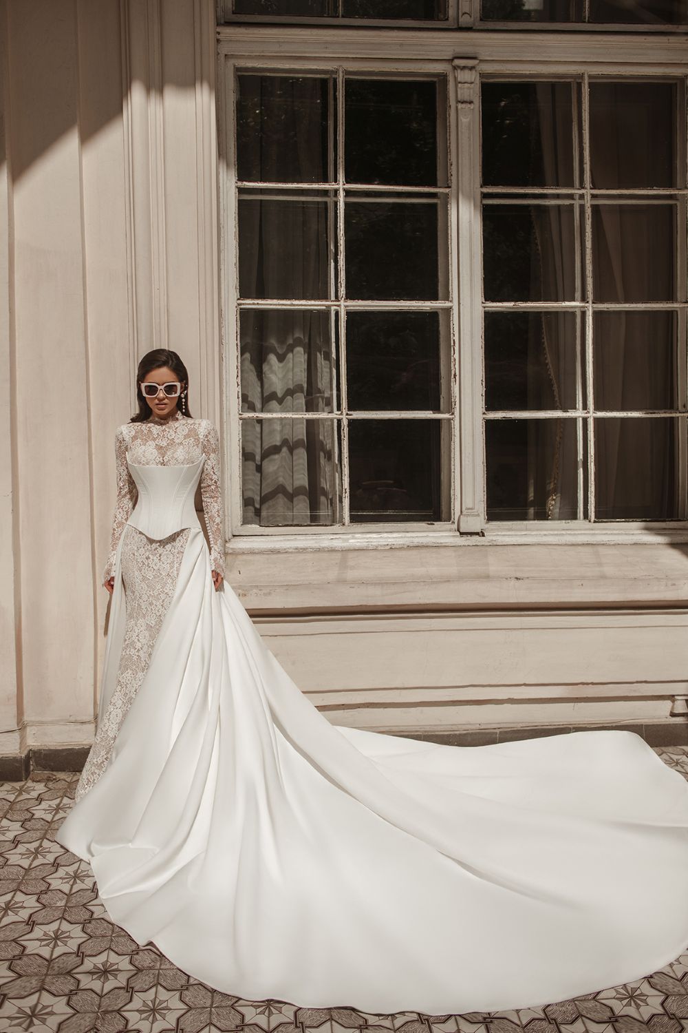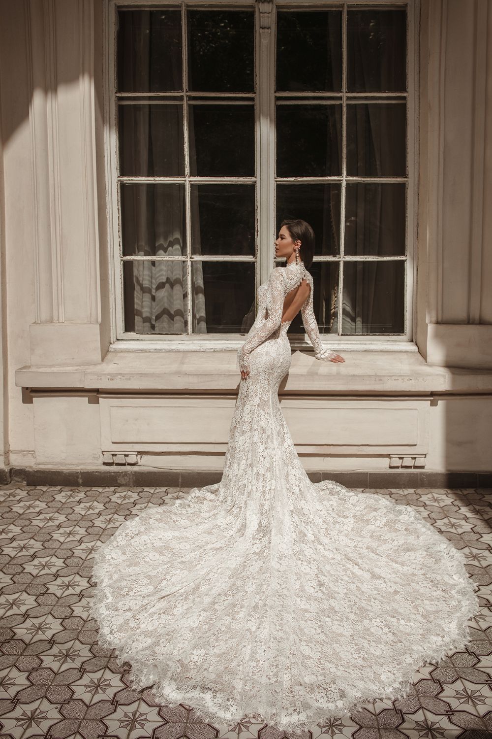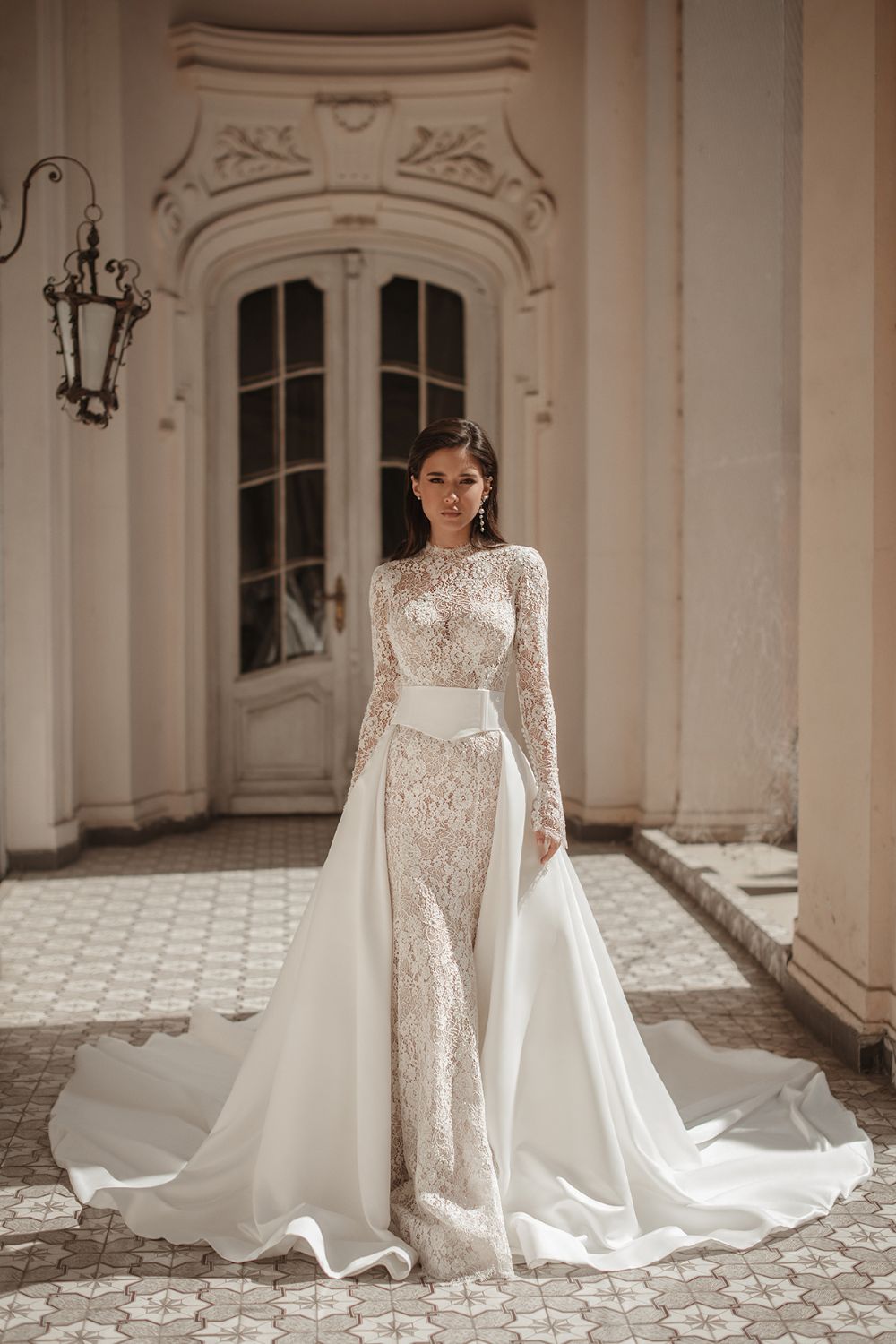 δαντελα guipure με κλειστο λαιμο και μανικια μακρια με ανοιχτη πλατη, υπαρχουν και διαφορες εξτρα φουστες που μπαινουν απο πανω για πιο δραματικη εμφανιση