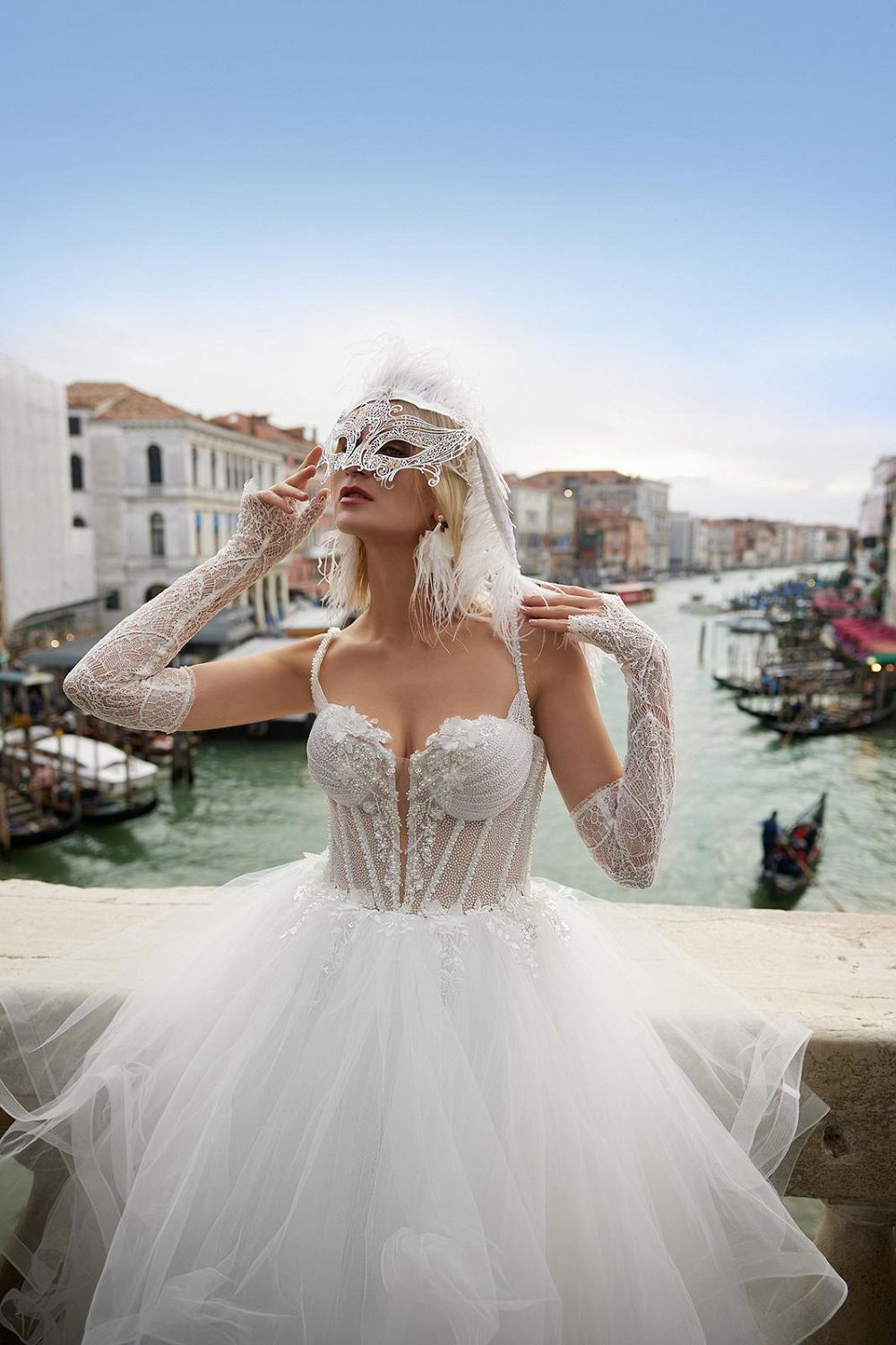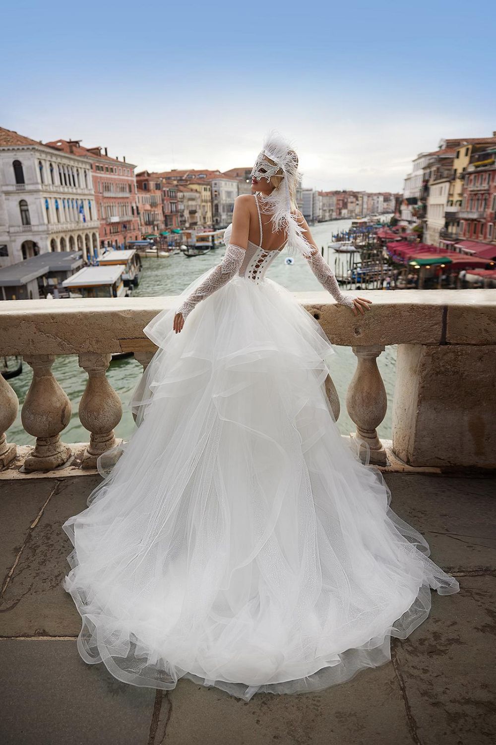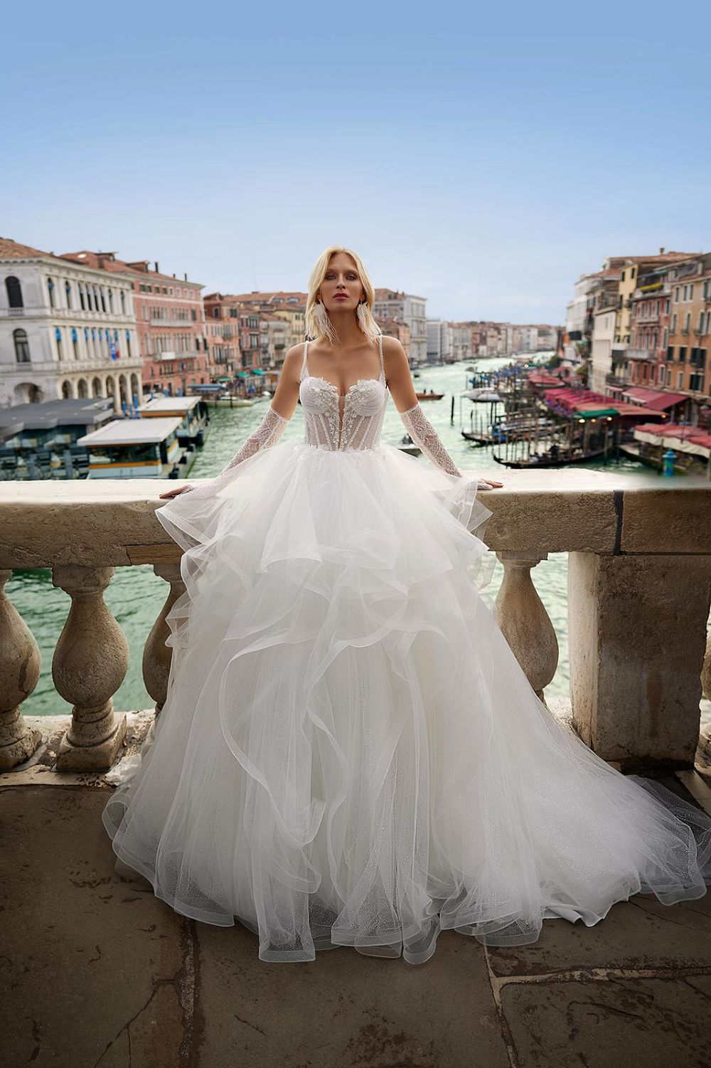 πολυ εντυπωσιακο νυφικο λαμπερο με κεντημενο κορσε καρδια με τιραντακι και φουστα πλουσια ολο γκλιτερ και βολαν