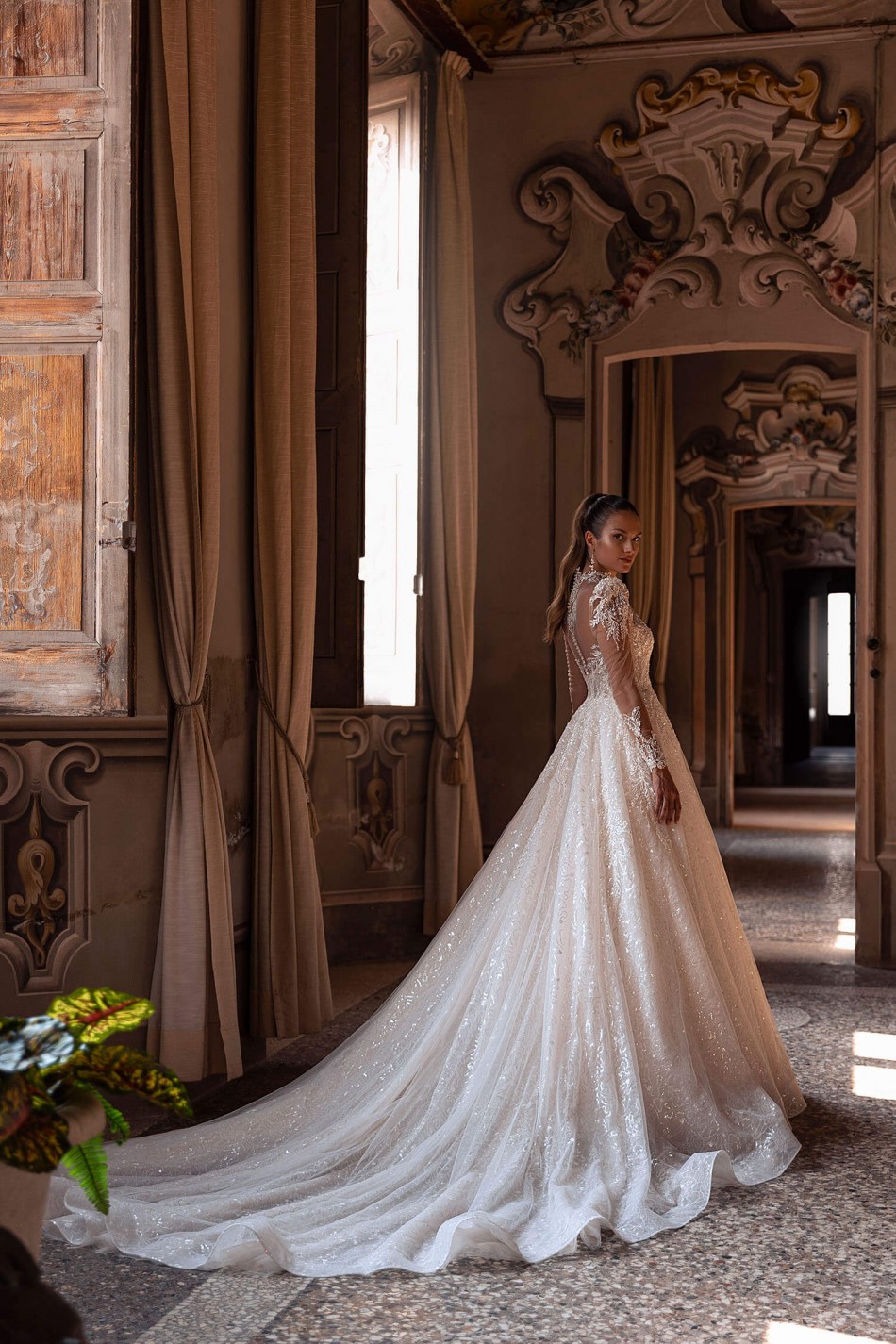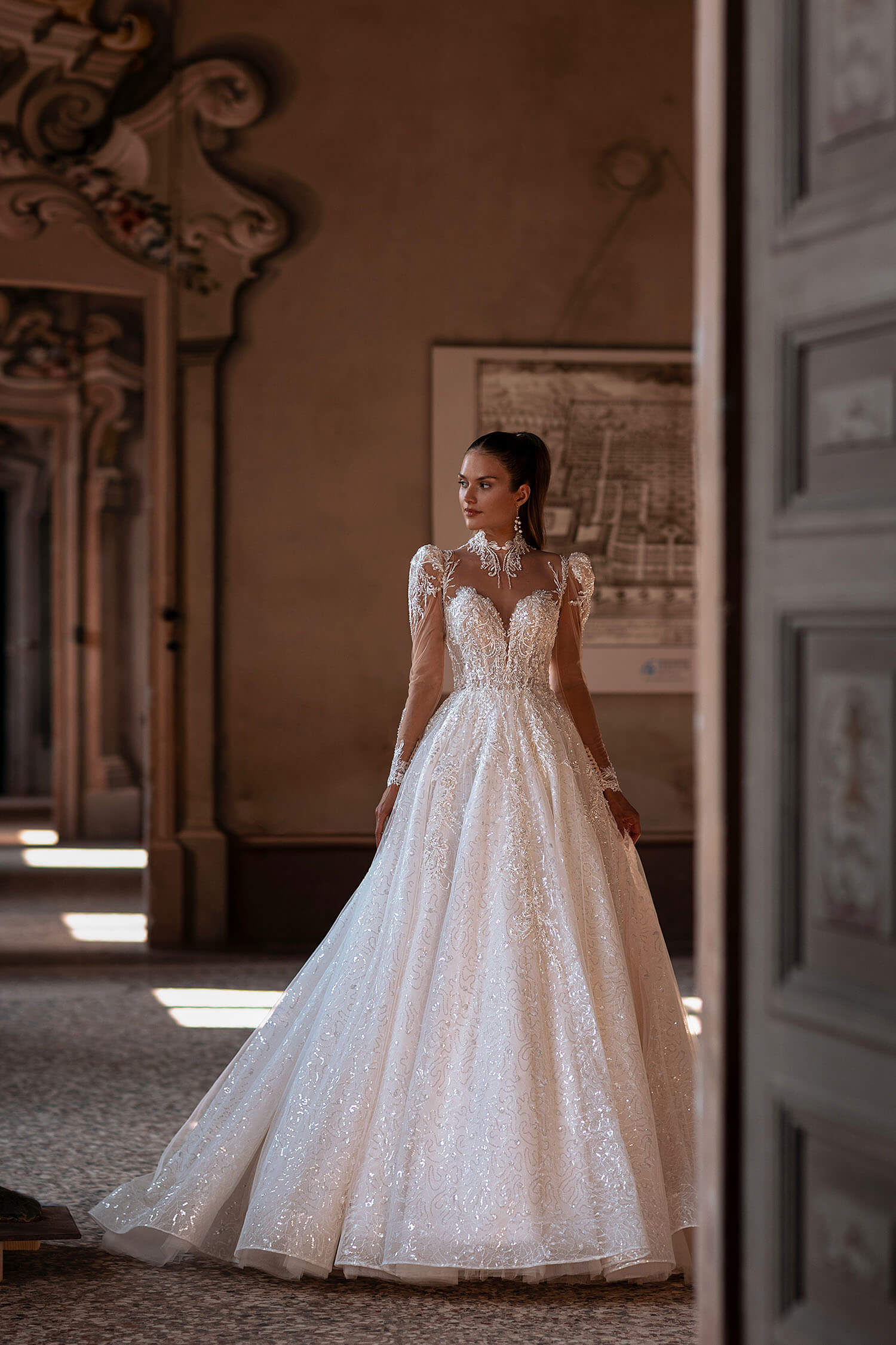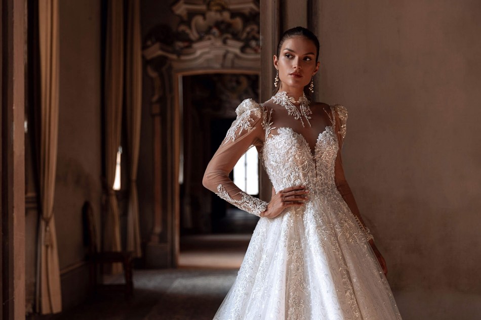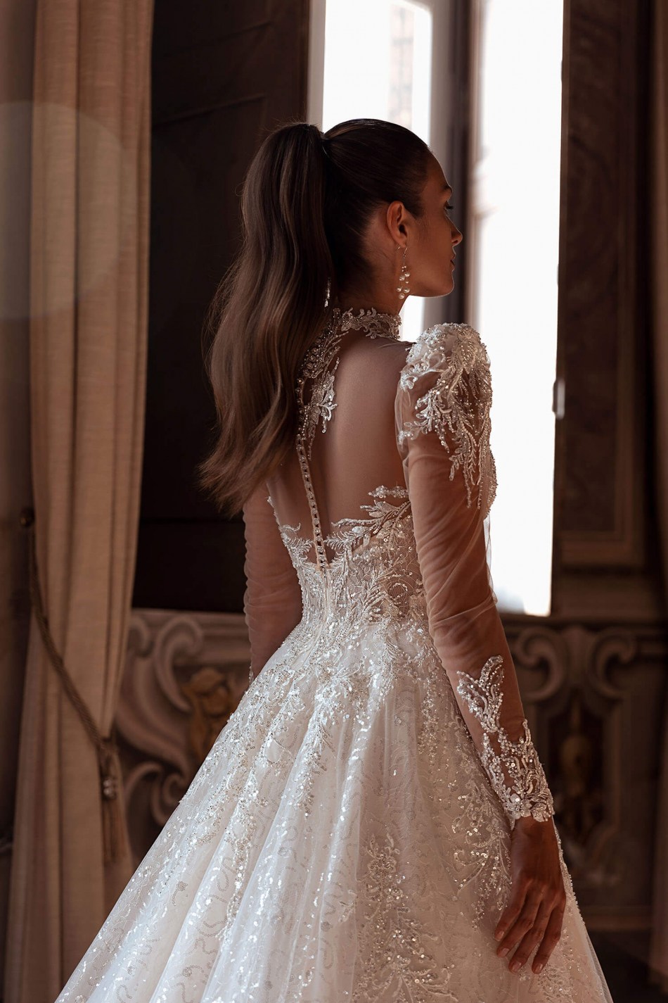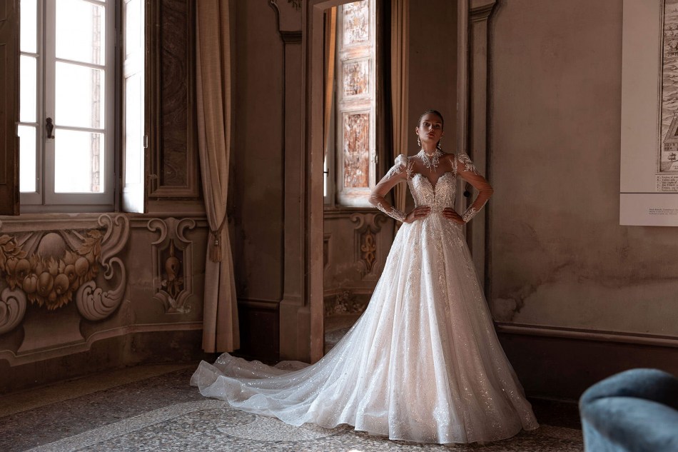 εντυπωσιακο λαμπερο νυφικο σε μπουστο κεντημενο με δαντελα, φουστα απο γκλιτερ εσωτερικα και μακρυ μανικι με βατες, κοσμημα στο λαιμο