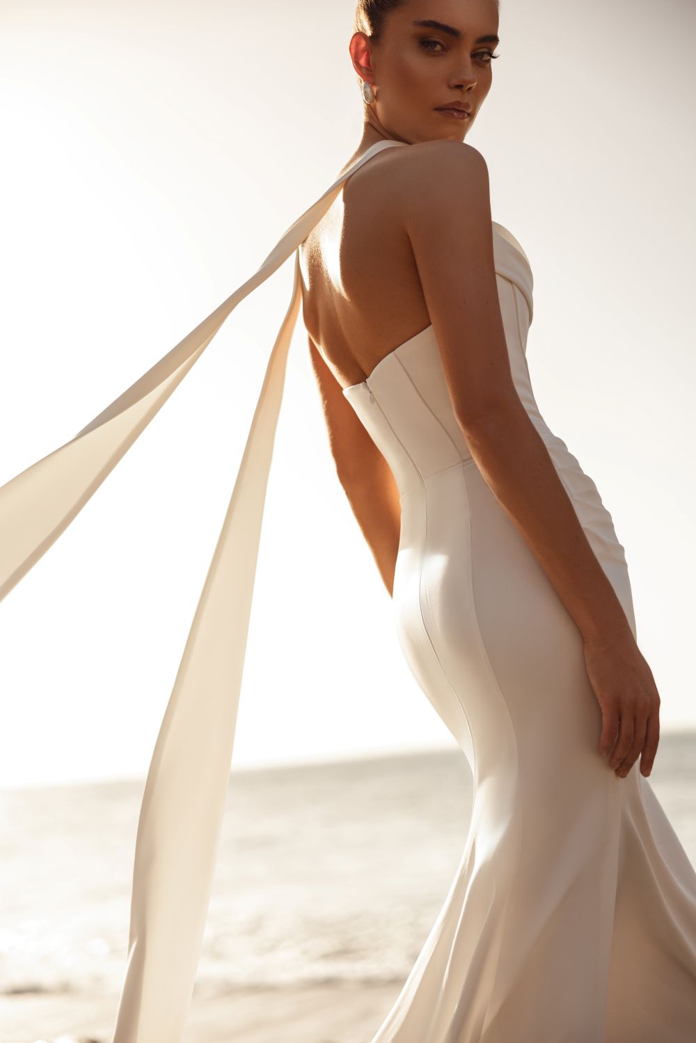 Το ντεκολτέ χωρίς τιράντες με απαλά διπλωμένο τελείωμα δίνει στο φόρεμα μια κομψή γραμμή